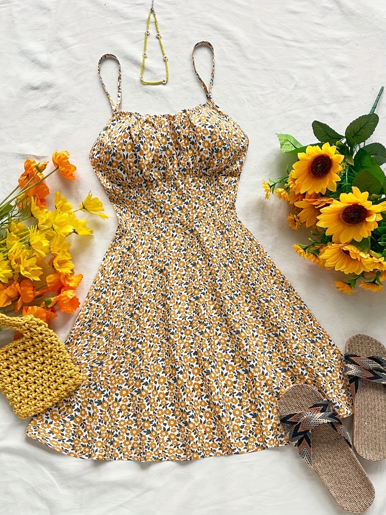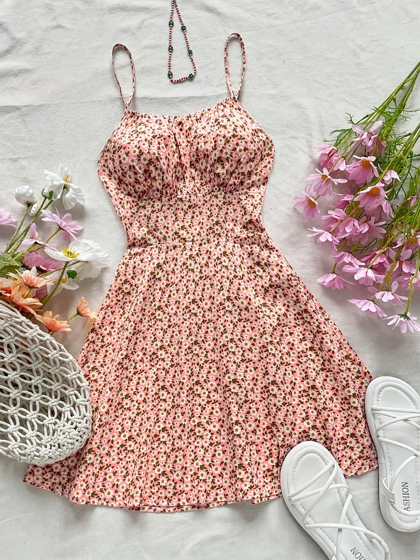Women’S Ditsy Floral Backless Strap Sundress With Adjustable Bow Tie Waist – Knee-Length Sleeveless Summer Dress, Machine Washable Lightweight Fabric For Beach Vacations & Casual Outings, Vacation Attire, Nontransparent Material