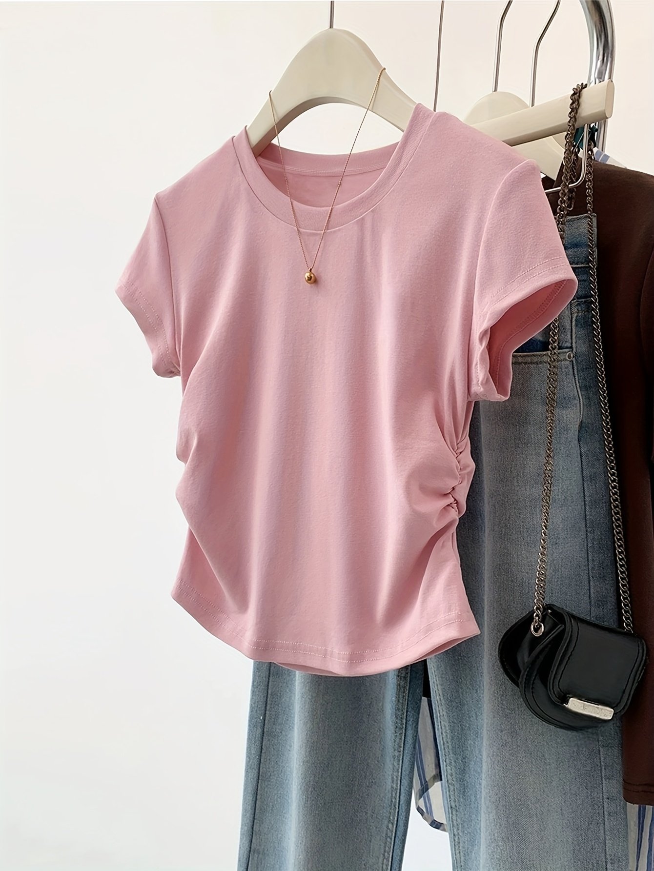 Women’S Elegant Ruffled Short Sleeve T-Shirt – Round Neck Casual Top, Solid Color, Machine Washable, All-Season Comfort Fit, Ladies T Shirts, Versatile Clothing, Simple Fashion, Texture
