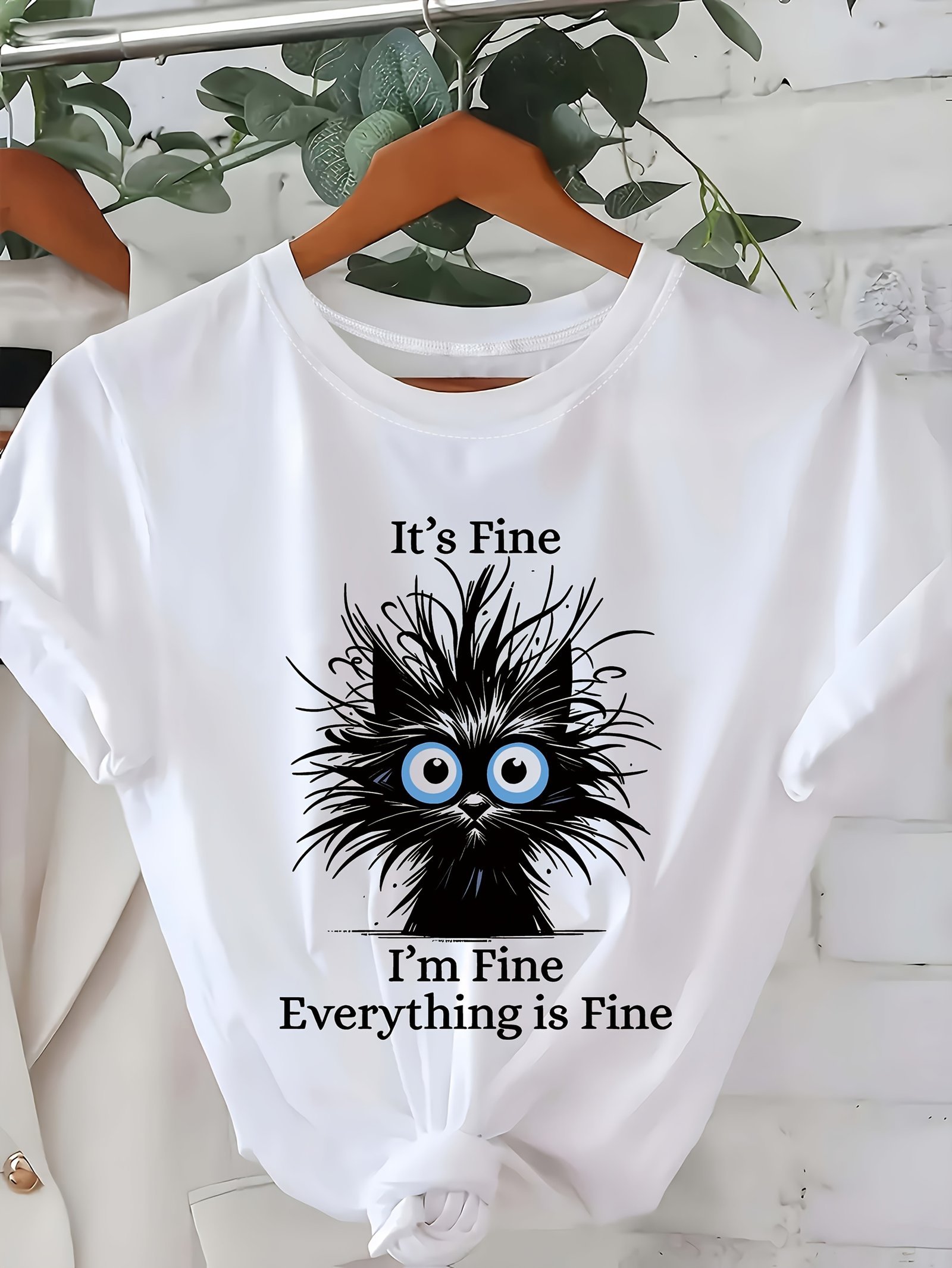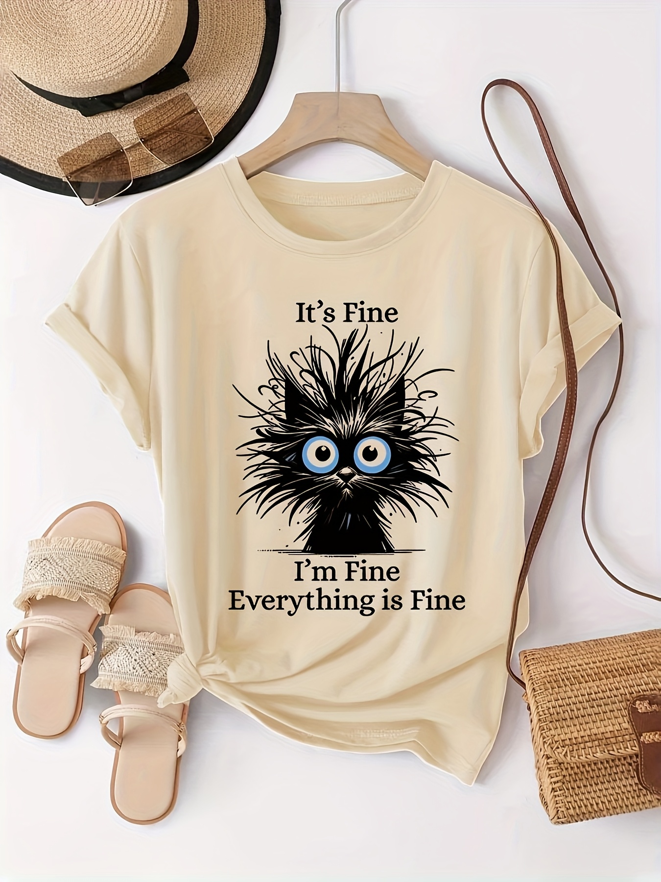 Women’S Light Blue Casual Short Sleeve T-Shirt – “It’S Fine I’M Fine Everything Is Fine” Sarcastic Cat Graphic Print, Round Neck Summer Fit, Medium Stretch Machine Washable Tee, Cat T Shirt, Everyday Apparel, Playful Design, Stretchy Fabric