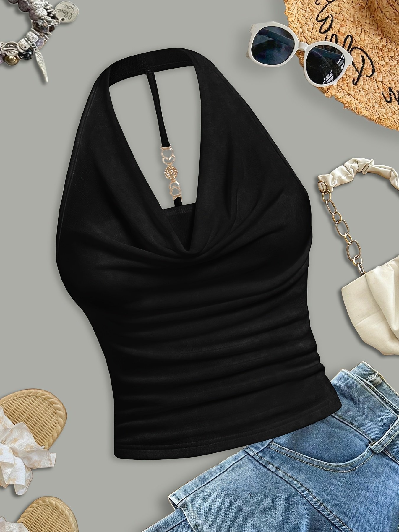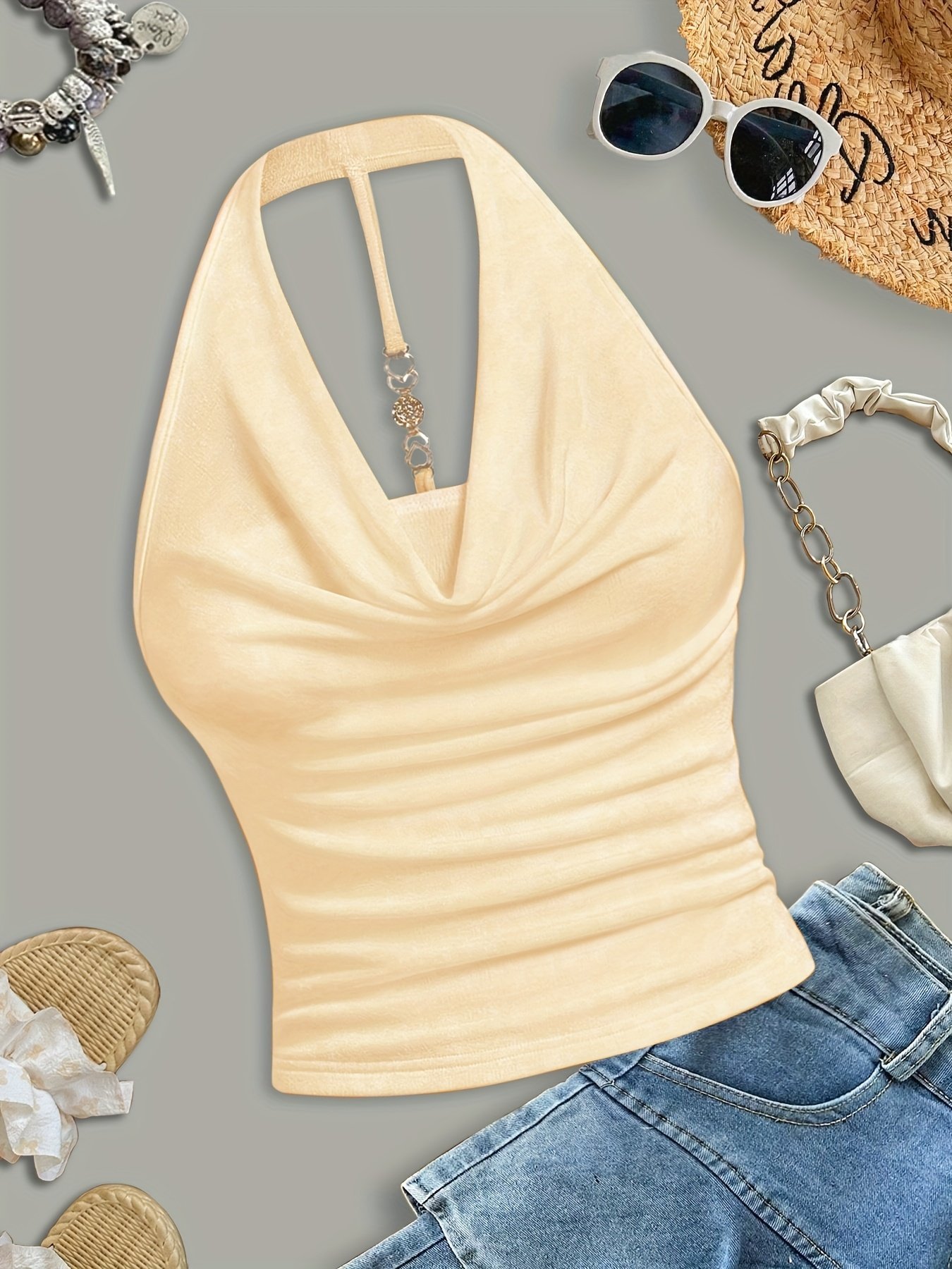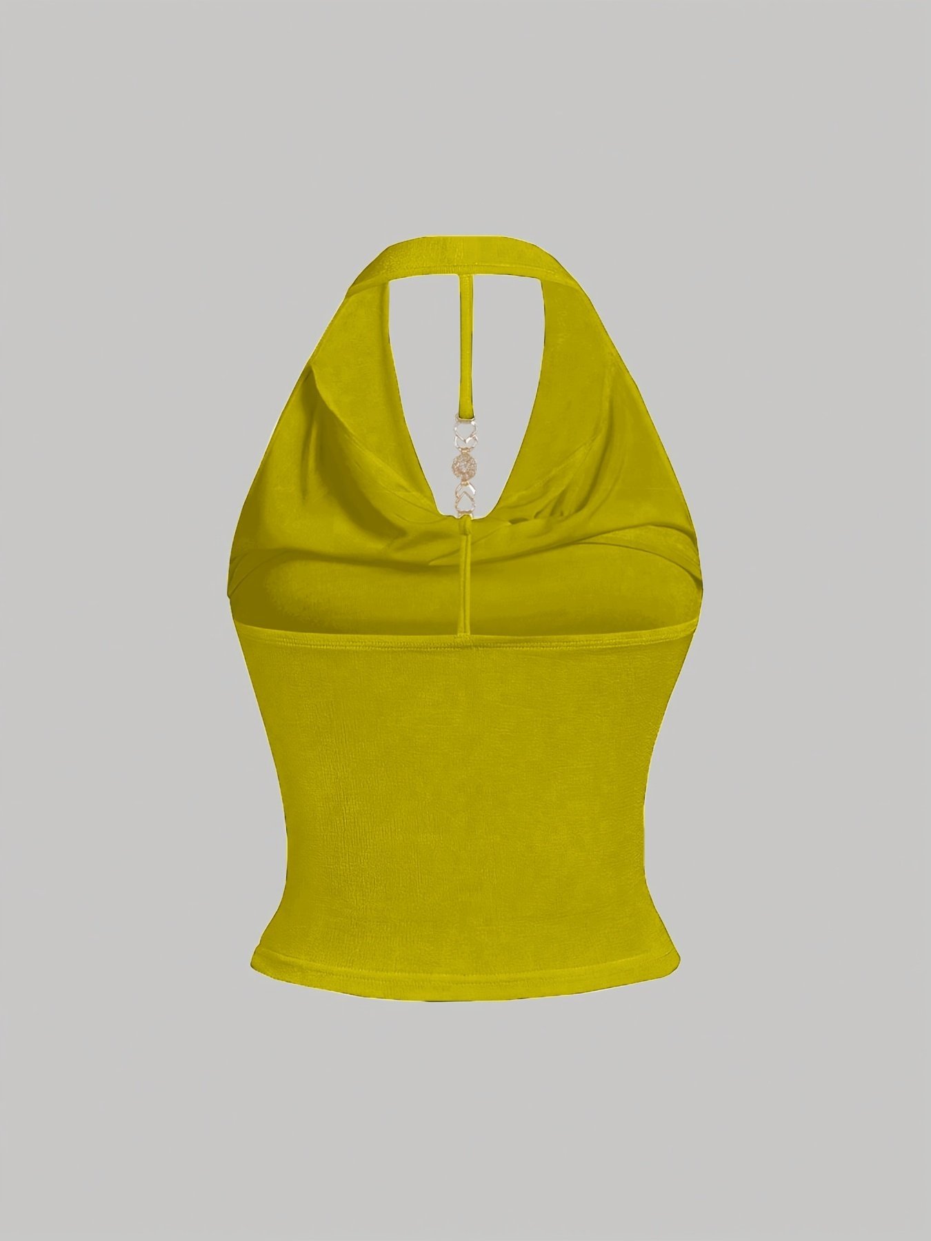 Women’S Sexy Halter Neck Sleeveless Top – Semi-Sheer Stretchy Slim Fit Backless Shirt, Vibrant Yellow Solid Color, Machine Washable For Casual & Evening Outfits, Evening Wear, Backless Design, Sensual Apparel, Semitransparent Material