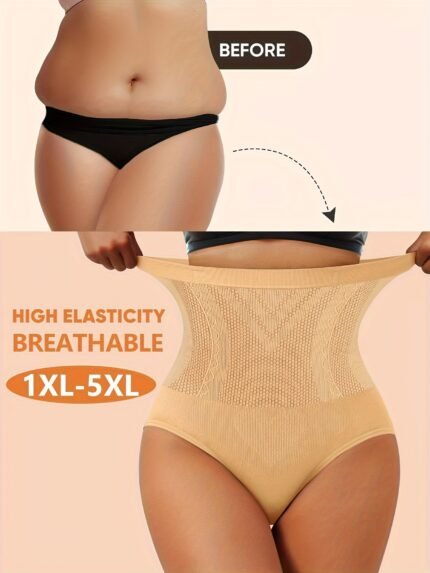 1-Pack Miotan Women’S Plus Size High-Waisted Tummy Control Seamless Underwear – Xl To 5Xl, Breathable Soft Stretch Fabric, Butt-Lifting Posture Support, Beige, Tummy Control Underwear, Body Shaping Underwear, Highwaist Design, Elasticity Underwear