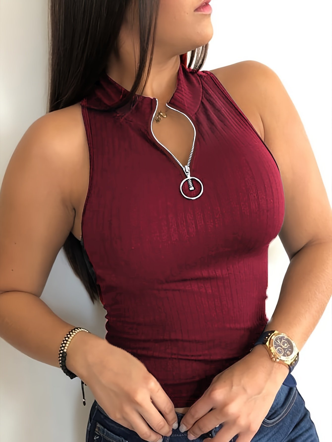 Zip Up Solid Tank Top, Casual Ribbed Sleeveless Tank Top For Summer, Women’S Clothing