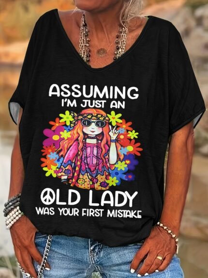 Women’S Casual Loose Fit V-Neck Short Sleeve T-Shirt – Vibrant Green Print With “Assuming I’M Just An Old Lady” Slogan & Floral Fashion Glasses Design, Medium Stretch Machine Washable Top For Spring Summer Fall, Ladies T Shirts, Relaxed Weekend Outfit, Playful Statement Shirt, Comfortable Stretch Fabric, Fun Statement Wear